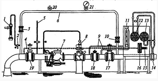 1 - предохранительный сбросной клапан; 2 - кран к сбросному клапану; 3 - задвижка на байпасе; 4 - импульсная трубка конечного давления; 5 - продувочная свеча; 6 - обводная линия (байпас); 7- регулятор давления; 8 - предохранительно-запорный клапан; 9 - импульсные трубки до и после фильтра; 10 - кран на байпасе; 11- дифференциальный манометр дм замера перепада давления на фильтре; 12 - расходомер; 13 - регистрирующий манометр входного давления; 14-диафрагма; 15 - показывающий манометр выходного давления; 16 - регистрирующий манометр выходного давления; 17 - входная задвижка; 18 - фильтр; 19-выходная задвижка; 20 - продувочный трубопровод с краном; 21 - манометр на байпасе