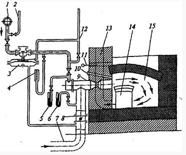 1 - газовый коллектор; 2 - продувочный газопровод; 3 - клапан блокировки газа и воздуха; 4 - запальник; 5, 6 - манометры для газа и воздуха; 7 - воздухопровод; 8 - воздушная регулировочная заслонка; 9 - горелка; 10 - смотровое и запальное отверстия; 11 - шибер; 12 - газопровод безопасности; 13 - дымоход; 14 - загрузочное окно; 15 - рабочая камера