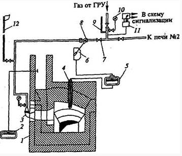 1 - печь; 2 - тягомер; 3 - инжекционная горелка; 4 - термопара; 5 - регулятор температуры; 6 - исполнительный механизм; 7 - запорный кран; 8 - регулирующий кран; 9 - продувочный газопровод; 10 - манометр; 11 - сигнализатор падения давления газа; 12 - газопровод безопасности
